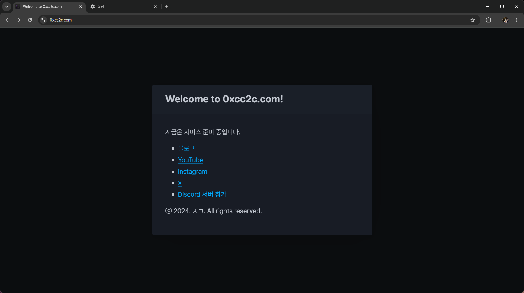 Welcome to 0xcc2c.com! 지금은 서비스 준비 중입니다. ⓒ 2024. ㅊㄱ. All rights reserved.