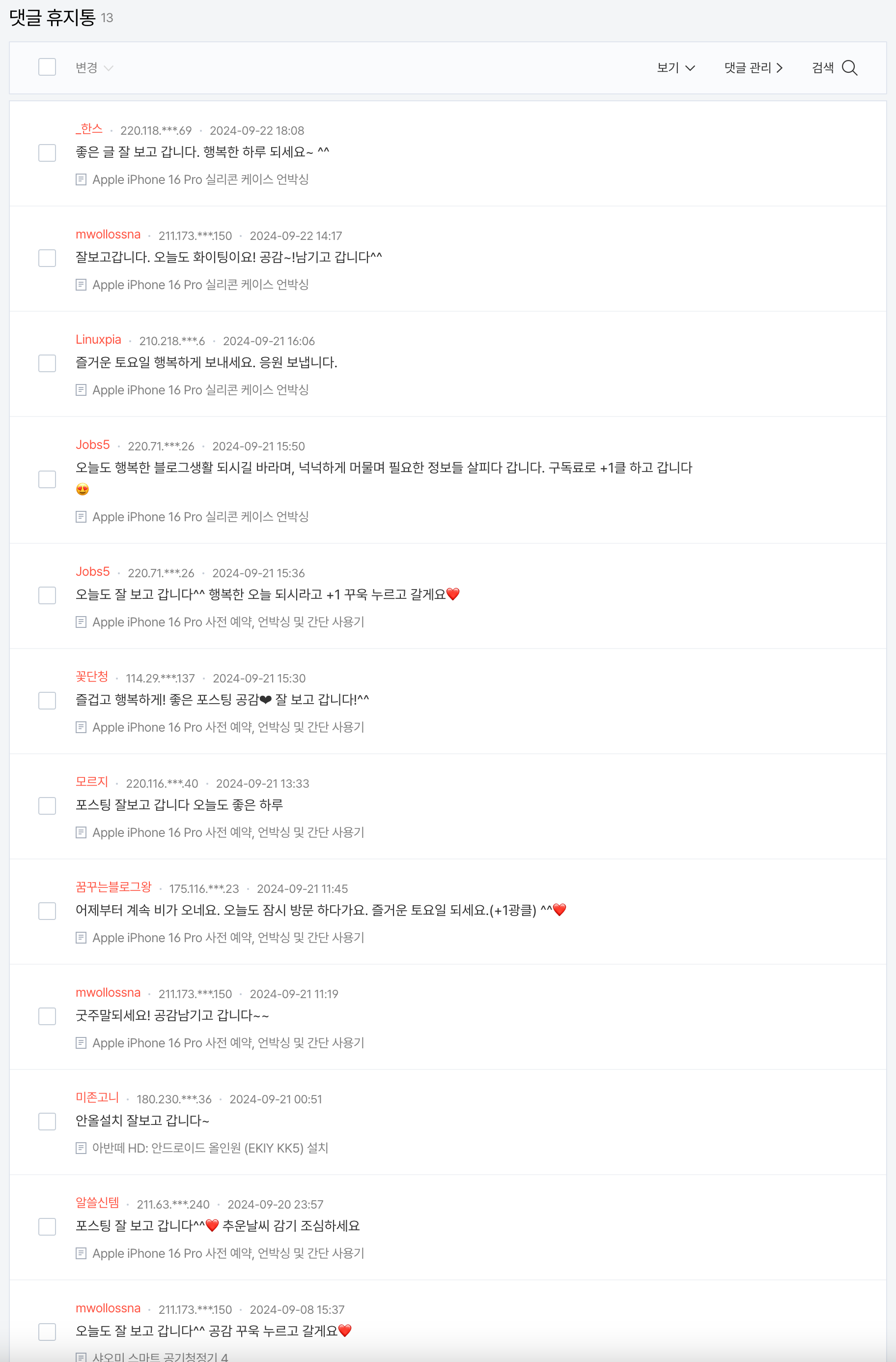 최근 들어 아래와 같은 매크로성 댓글이 휴지통에서 다수 발견되고 있는데요.